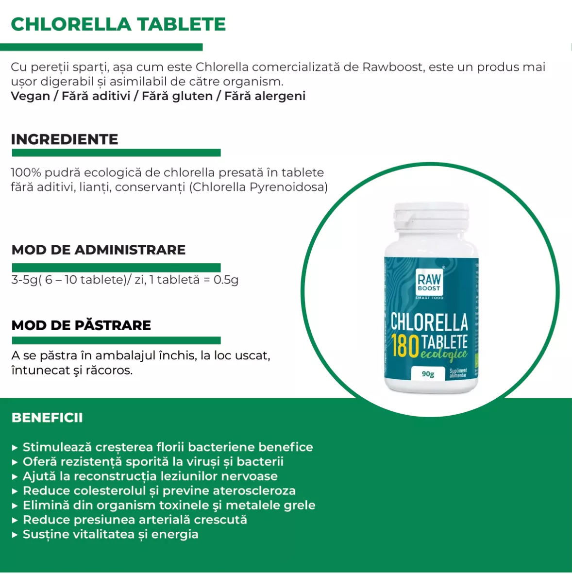 Chlorella cu pereții sparți, așa cum este Chlorella comercializată de Rawboost, este un produs mai ușor digerabil și asimilabil de către organism. Este o proteină completă, bogată în grăsimi extrem de sănătoase pentru organism, ARN, vitamine și minerale. Chlorella crește rezistența organismului la infecții virale și bacteriene (superoxidul, un element pe care această algă îl conține este o armă foarte puternică pe care celulele albe o folosesc pentru distrugerea bacteriilor).