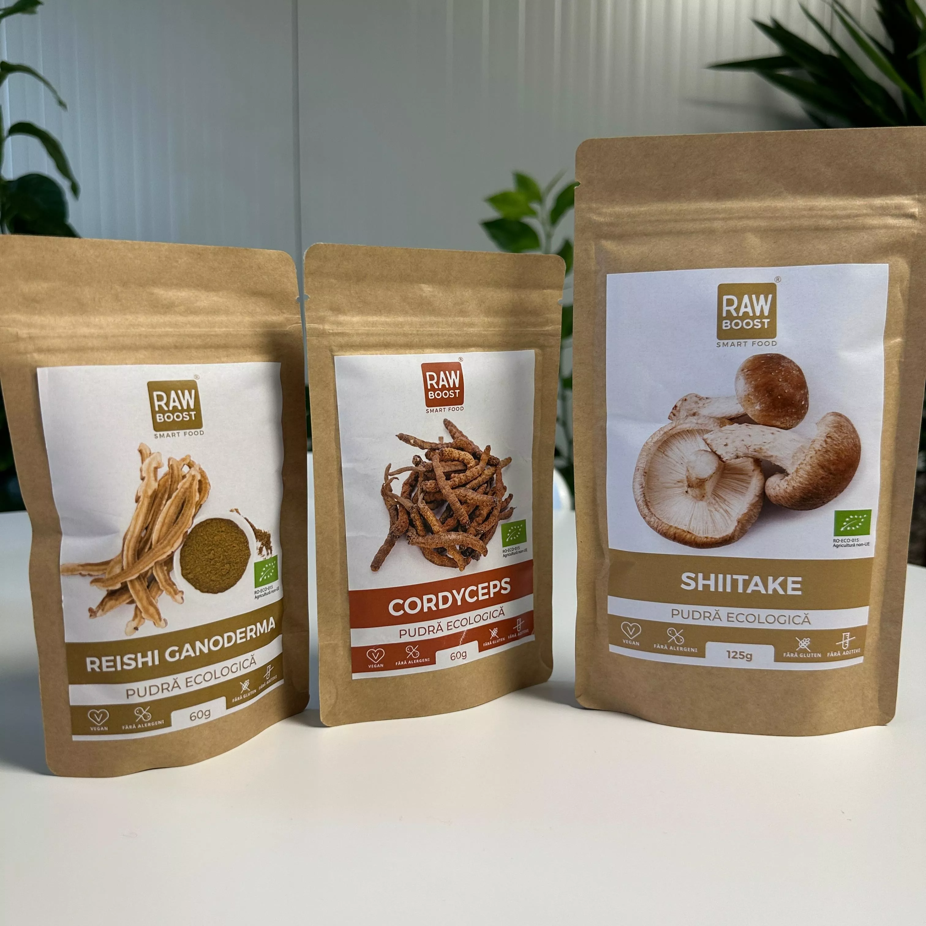 Acest pachet reunește cele mai valoroase ciuperci medicinale – Cordyceps pentru energie și vitalitate, Shiitake pentru imunitate și sănătate cardiovasculară, și Reishi pentru relaxare și echilibru interior.