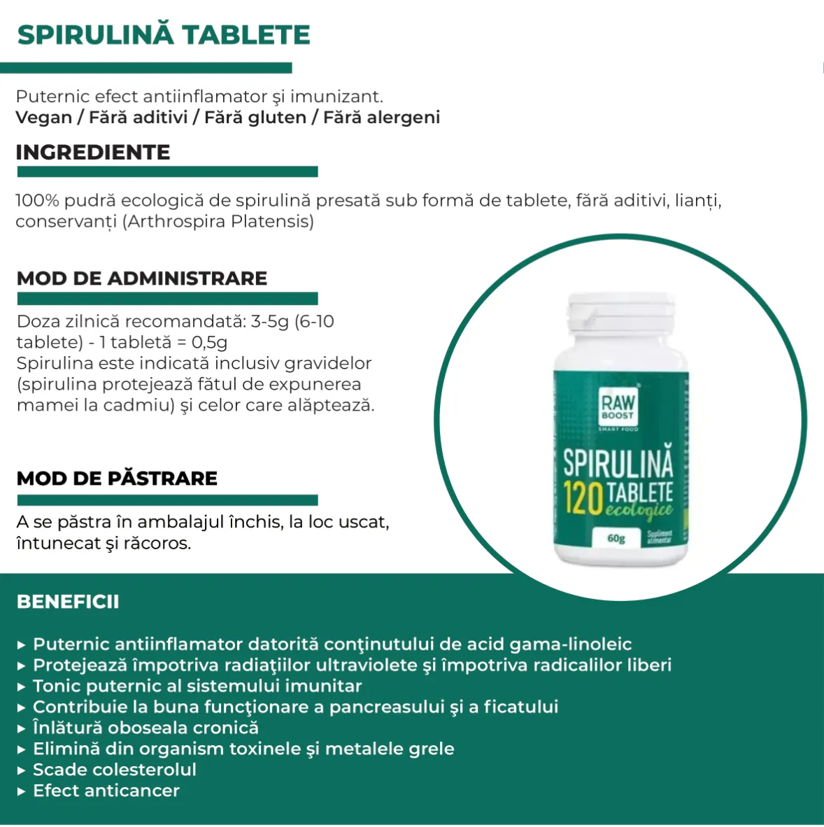 Ingrediente/tabletă: 100% pulbere de spirulină (Arthrospira Platensis) presată sub formă de tablete, fără aditivi, lianți, conservanți etc.*