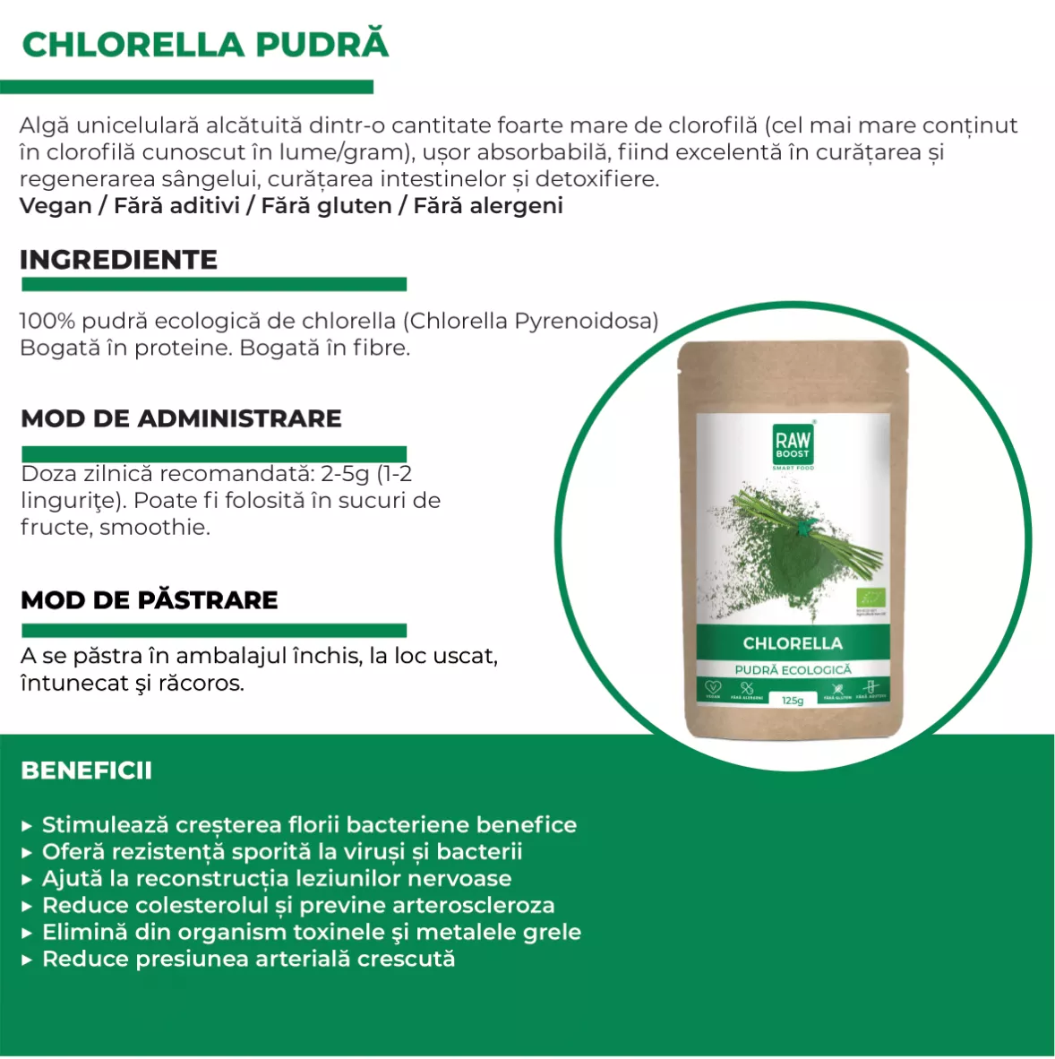 Chlorella cu pereții sparți, așa cum este Chlorella comercializată de Rawboost, este un produs mai ușor digerabil și asimilabil de către organism. Este o proteină completă, bogată în grăsimi extrem de sănătoase pentru organism, ARN, vitamine și minerale. Chlorella crește rezistența organismului la infecții virale și bacteriene (superoxidul, un element pe care această algă îl conține este o armă foarte puternică pe care celulele albe o folosesc pentru distrugerea bacteriilor).