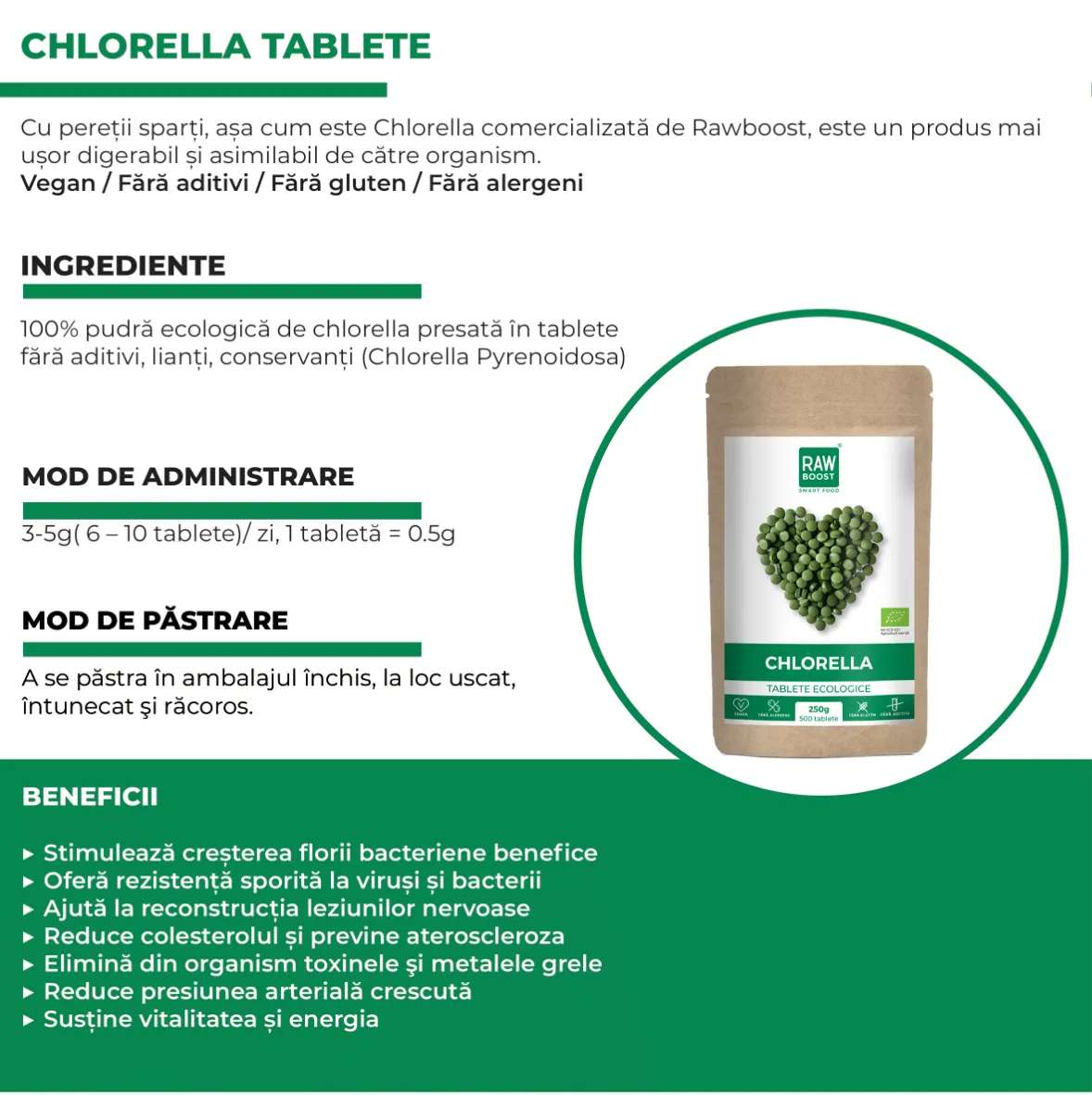 Chlorella cu pereții sparți, așa cum este Chlorella comercializată de Rawboost, este un produs mai ușor digerabil și asimilabil de către organism. Este o proteină completă, bogată în grăsimi extrem de sănătoase pentru organism, ARN, vitamine și minerale. Chlorella crește rezistența organismului la infecții virale și bacteriene (superoxidul, un element pe care această algă îl conține este o armă foarte puternică pe care celulele albe o folosesc pentru distrugerea bacteriilor).