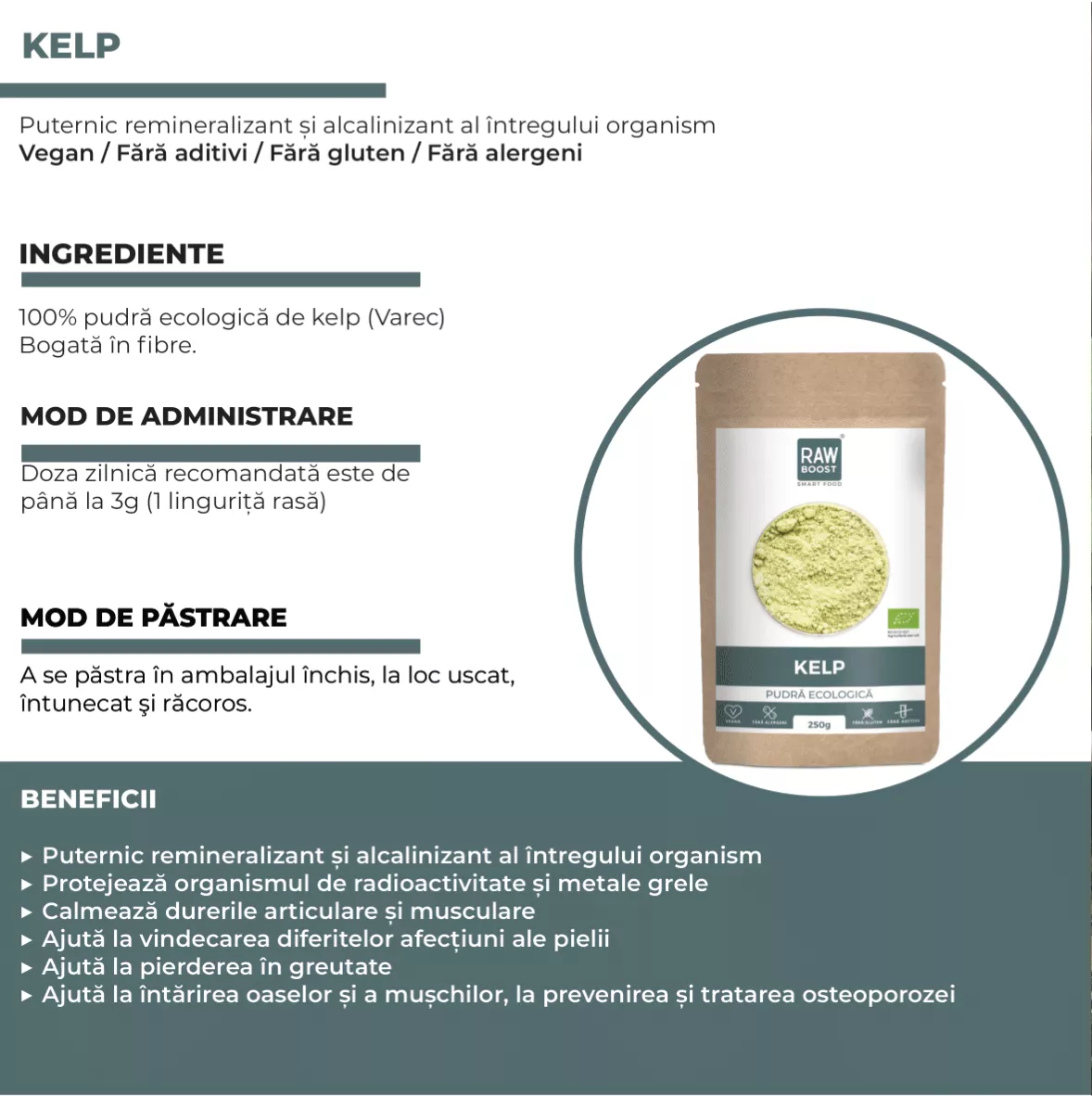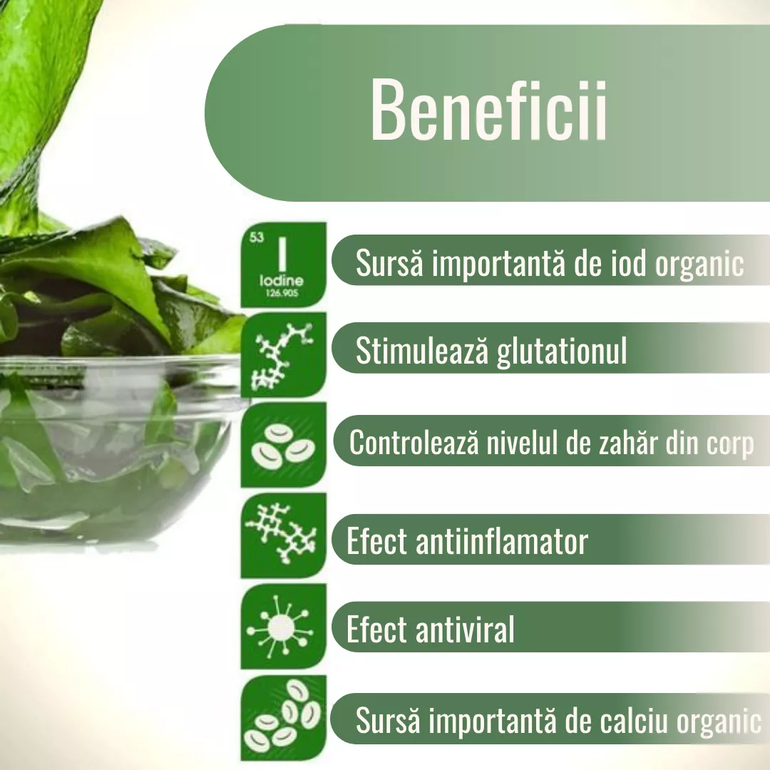 Kelp este o algă marină care trăiește în principal pe coastele Norvegiei și pe coasta de est a Canadei. Este un puternic mineralizant și alcalinizant al întregului organism, datorită conținutului a peste 30 de minerale și oligoelemente. Un oligoelement important prezent în acest tip de algă este iodul organic, care protejează organismul de radioactivitate și metale grele. Pe lângă minerale și oligoelemente, algele Kelp mai conțin: 21 de aminoacizi, carbohidrați simpli și complexi, hormoni de creștere vegetali, vitamine (K, C, B-uri), minerale, enzime și antioxidanți.