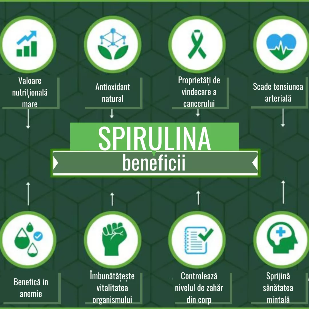 Bogată în antioxidanți, proteine și fibre, spirulina este utilizată astăzi ca supliment alimentar pentru susținerea sănătății și vitalității.