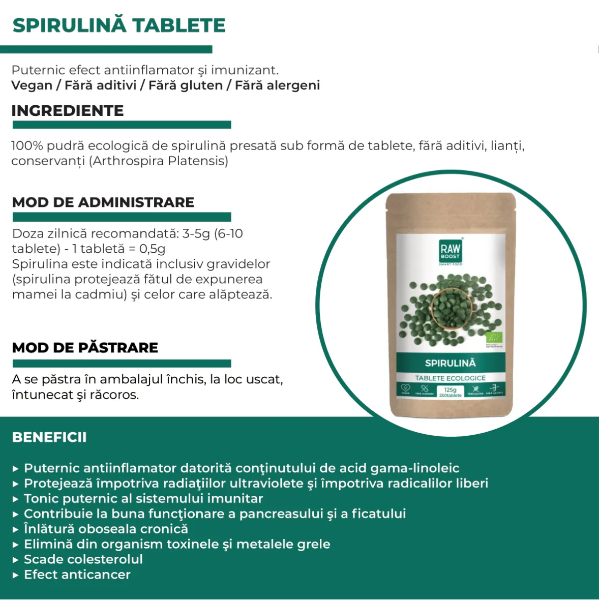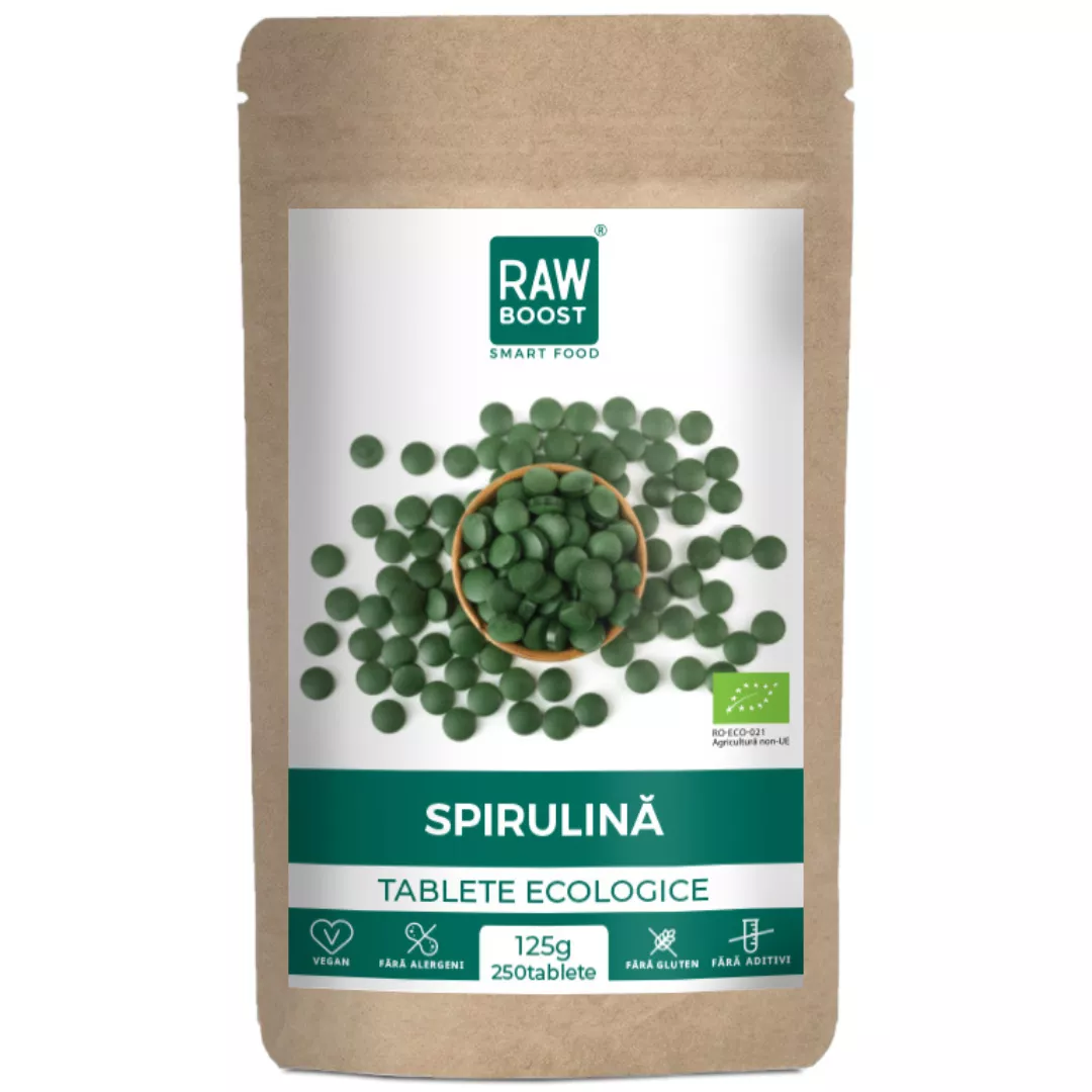 100% pudră ecologică de spirulină presată sub formă de tablete, fără aditivi, lianți, conservanți (Arthrospira Platensis)