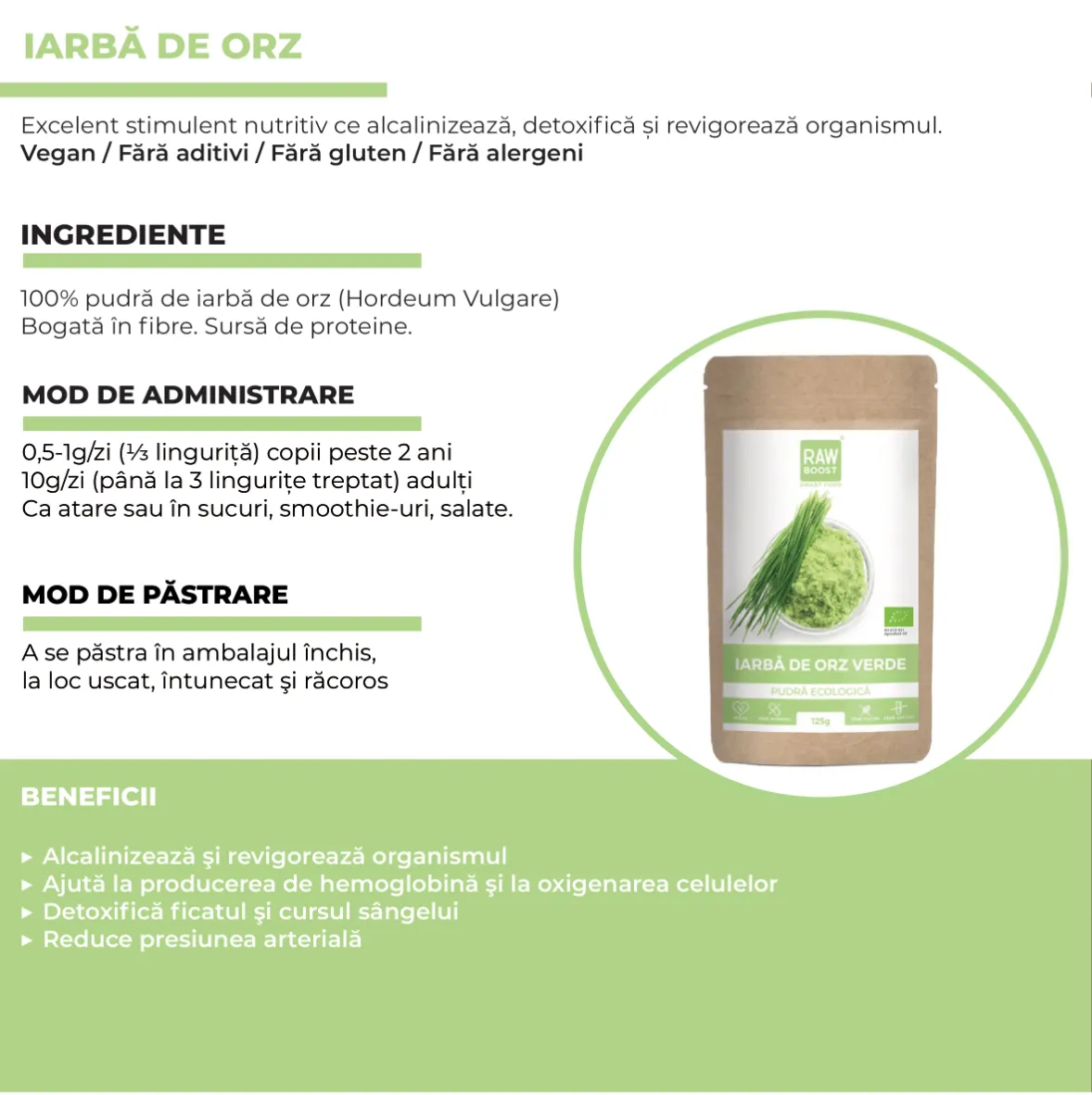 Iarba de orz este un excelent supliment nutritiv ce alcalinizează şi revigorează organismul. Are o concentraţie foarte mare de proteine (18 aminoacizi), minerale (calciu, fier, magneziu, cupru, zinc, mangan, seleniu şi fosfor), vitamine (A, C, B1, B2, B3, B5, B6, B9, B12, E), enzime (mai mult de 80 de tipuri) şi fibre. Pudra de iarbă de orz conţine o cantitate foarte mare de clorofilă ce ajută la producerea de hemoglobină şi la oxigenarea celulelor.