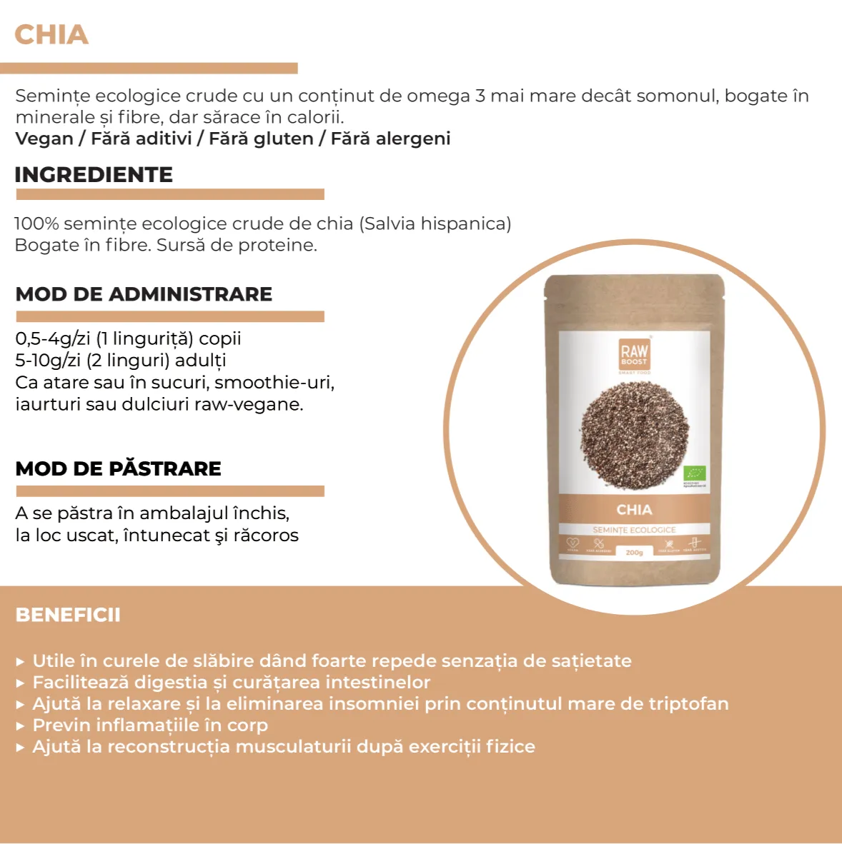 Semințele de Chia, declarate de nutriționiști vedetele anului 2013, conțin o cantitate impresionantă de fibre/100grame: 33,7g, de 8 ori mai mult Omega 3 decât somonul, Omega 6, antioxidanți (de 3 ori mai puternici decât afinele), calciu (de 5 ori mai mult decât laptele), bor (care ajută la absorția calciului în oase), fier (de 3 ori mai mult decât spanacul), potasiu (de 2 ori mai mult decât bananele), cupru, magneziu, zinc, seleniu, fosfor, vit. C (de 7 ori mai multă decât portocalele), Vit. A, complexul de B-uri (B1, B2, B3, B6, B8), Vit. E.