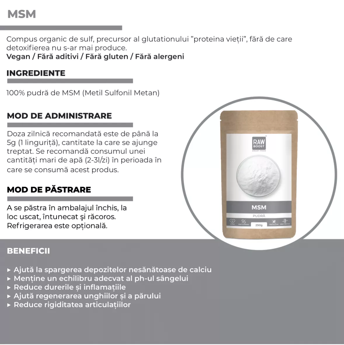 Msm pudră, compus organic de sulf, precursor al glutationului ”proteina vieții”, fără de care detoxifierea nu s-ar mai produce.