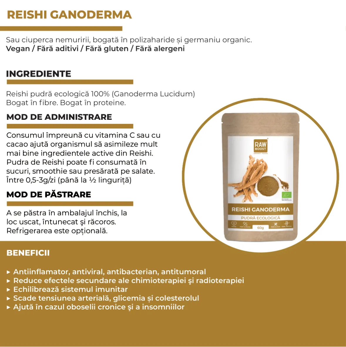 Reishi Ganoderma este o ciupercă ce creşte în natură pe scoarţa mai multor copaci. Fiind foarte greu de găsit ea se cultivă în scop comercial în Japonia, China şi alte părţi ale Asiei. Reishi este una dintre cele mai folosite ciuperci în scop medicinal din lume. Ciuperca nemuririi este cunoscută şi utilizată de mai bine de 2000 de ani în Extremul Orient şi a constituit mult timp un privilegiu al celor bogaţi. În China Antică numai împăraţii se puteau bucura de efectele benefice ale ciupercii Reishi. Ea conţine peste 200 de microelemente active, cele mai importante fiind polizaharidele, acizii ganoderici, germaniul organic, adenozina, aminoacizii şi proteinele.