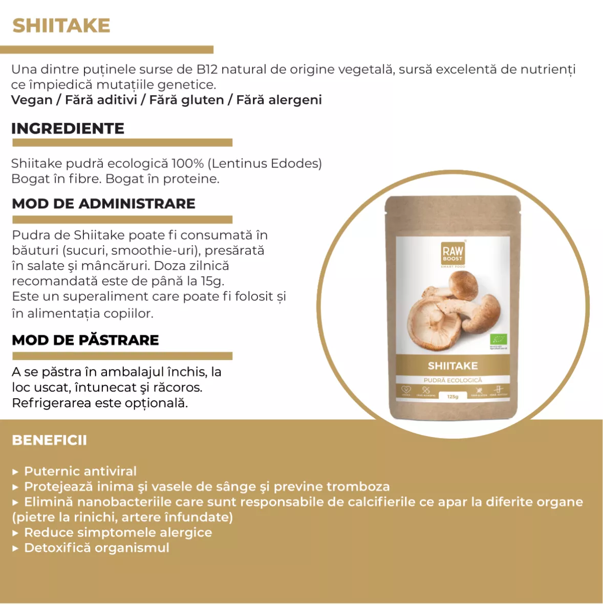 Ingrediente: 100% pudră ecologică de Shiitake (Lentinus Edodes)