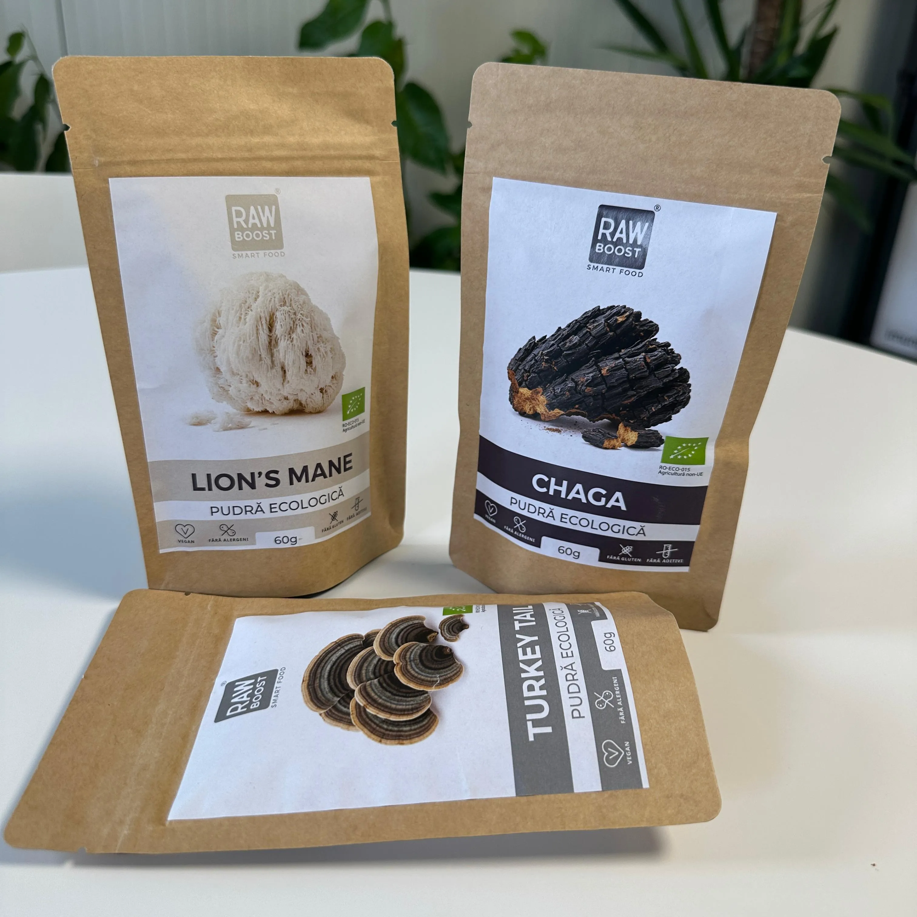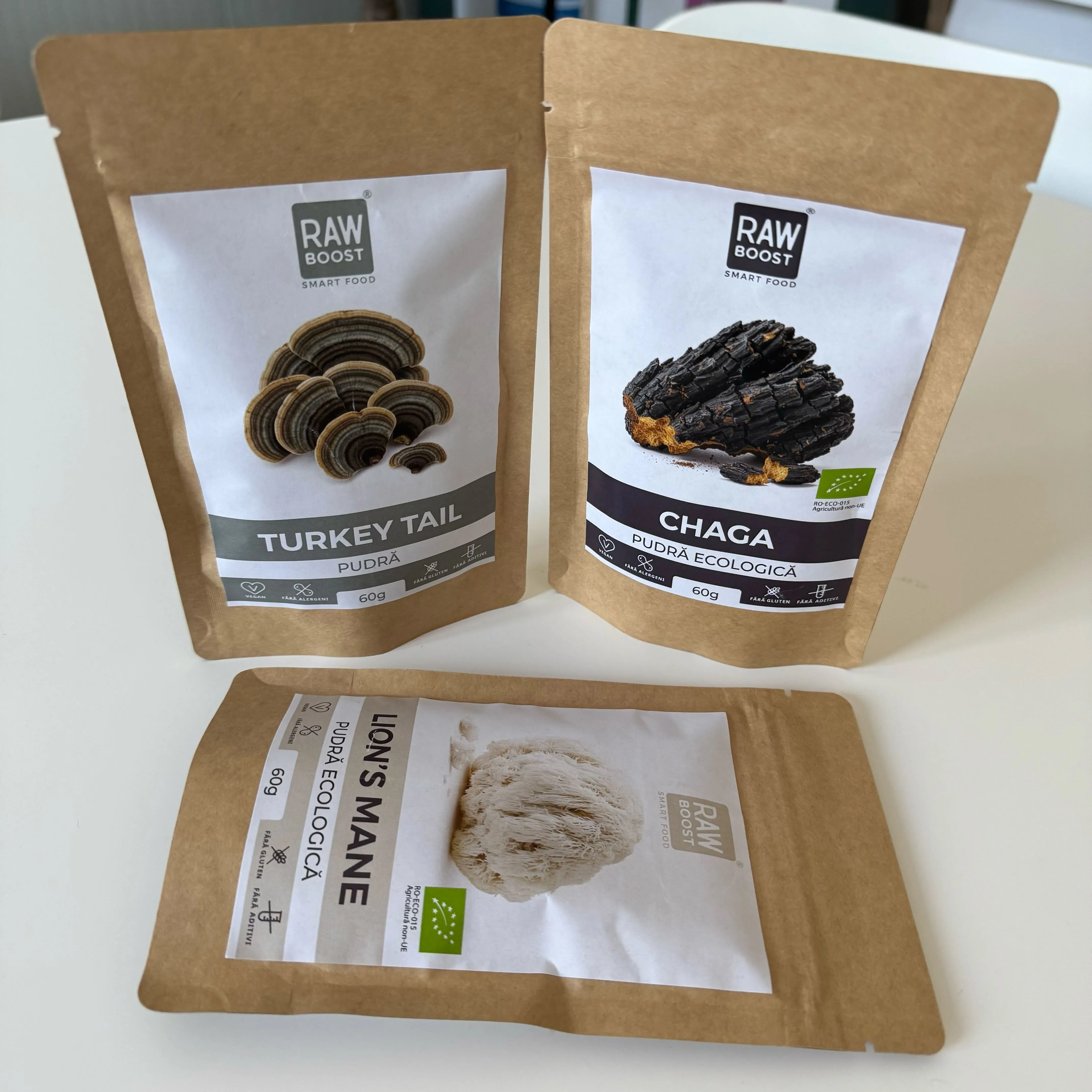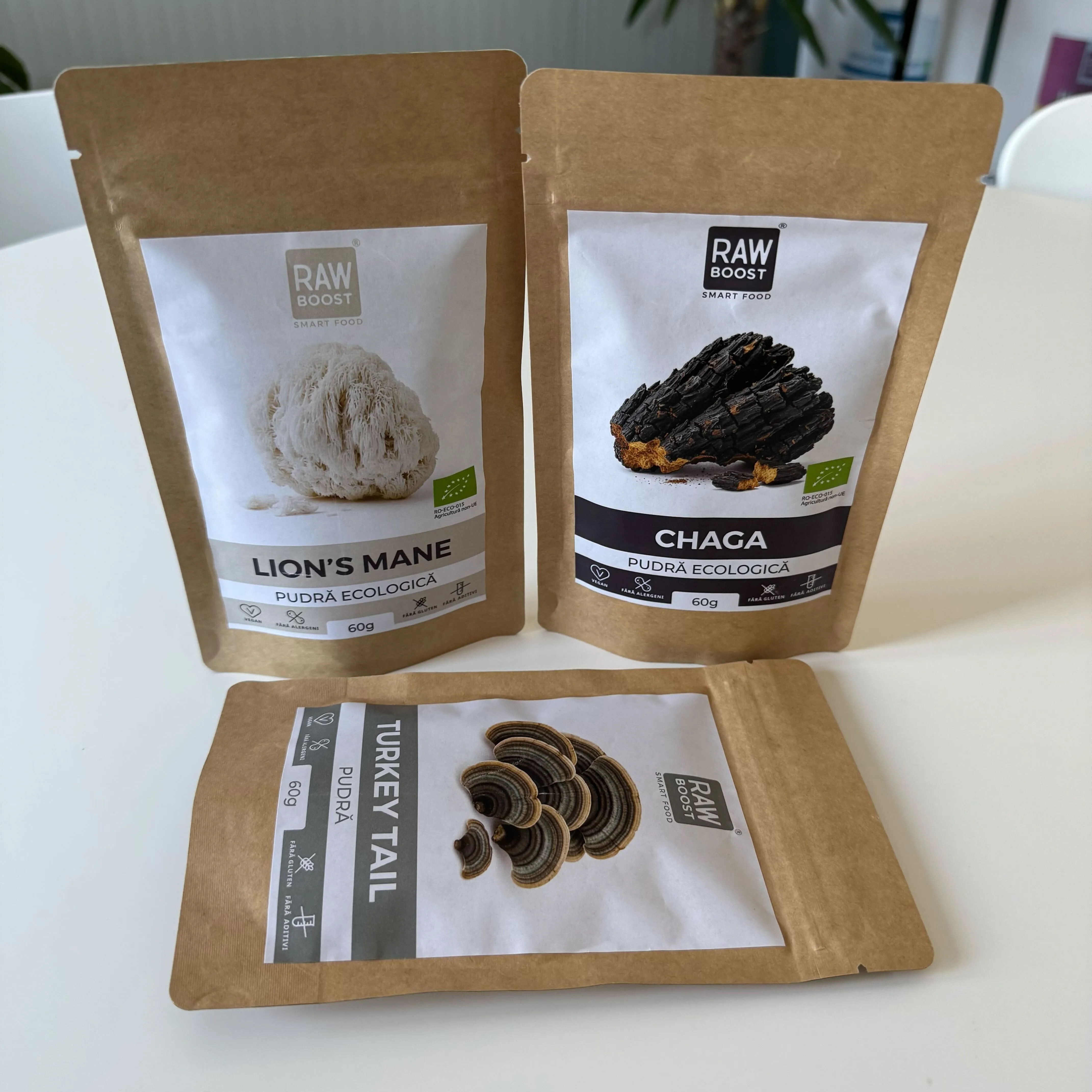 Acest pachet reunește trei dintre cele mai puternice ciuperci medicinale – Lion’s Mane pentru concentrare și claritate mentală, Turkey Tail pentru imunitate și echilibru intestinal, și Chaga pentru vitalitate și protecție antioxidantă.