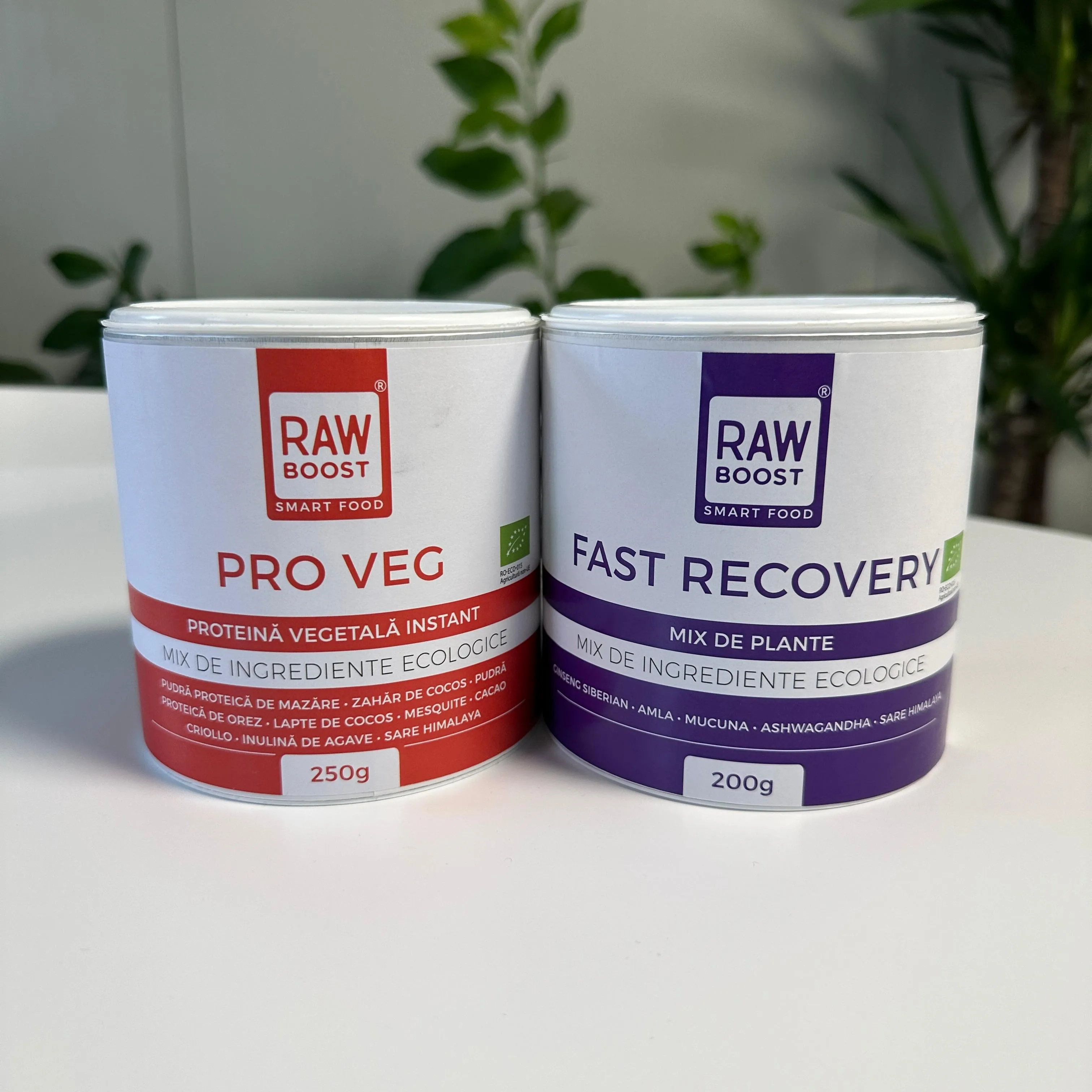 Acest pachet îți oferă combinația ideală pentru antrenamente eficiente: Pro Veg pentru energie și suport muscular și Fast Recovery pentru recuperare rapidă și reducerea oboselii.